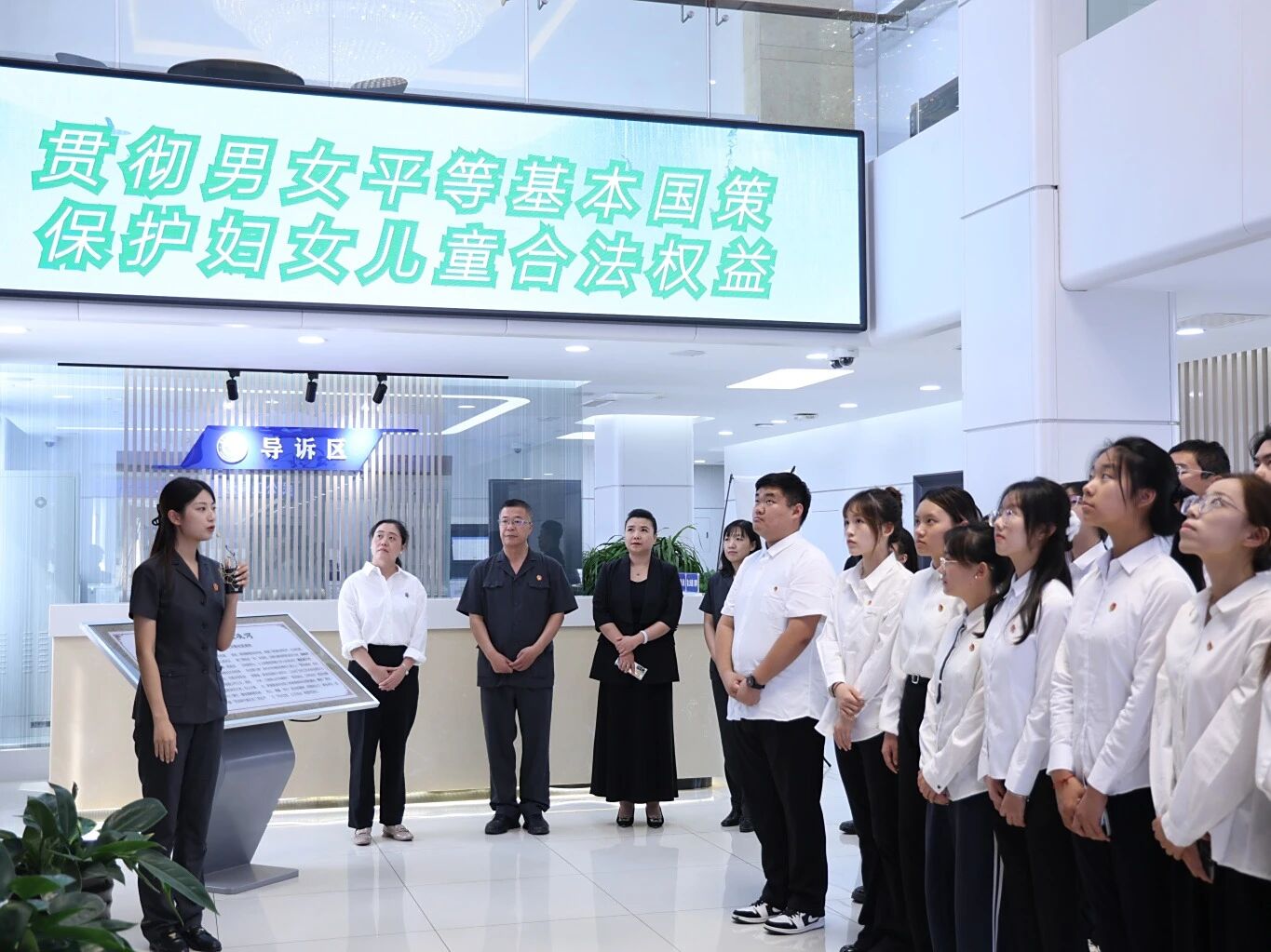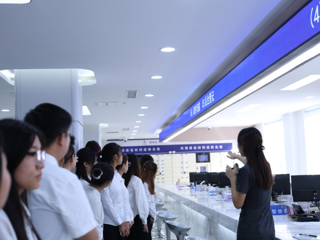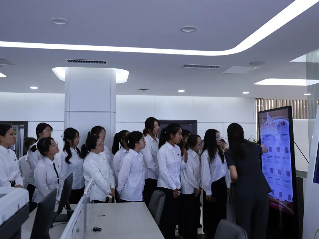 本次实践活动由团凌河区委组织对接,凌河区法院精心组织安排。活动中,从安检环节入手,法警向师生们进行了示范讲解,帮助师生感受司法场所的认真严肃;在诉讼服务中心大厅,浮雕壁画雕刻的“执法如山、清廉如水”职业追求给师生留下了深刻印象,彰显了法律的权威与庄严。随后,工作人员详细为师生们介绍了凌河区法院近年来开展的法律便民服务,同学们现场操作了智能流转云柜等自助服务区的先进技术设备,感受了便民服务区的周到服务,通过扫码了解民事答辩状的书写规范,切实感受数字服务带来的司法便捷。随后,在审判区域,同学们参观了调解室与法庭。在法官对法庭布局及象征意义的详细解说下,同学们直观感受了法治文化的深厚底蕴。