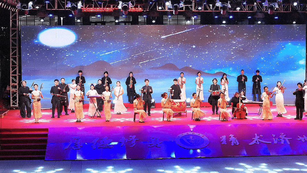 既有嫦娥探月勾勒的千年浪漫,又有东风利刃守护的山河无恙;既有交响乐章掀起的时代巨浪,又有三军将士踏出的和平担当。大学生艺术团华夏风韵民乐队、风铃鸟管弦乐队联袂带来的《月亮之上》描绘了一幅充满诗意、真挚又磅礴的画面,展现了个人情感与宏大意象,为现场观众带去艺术的享受。