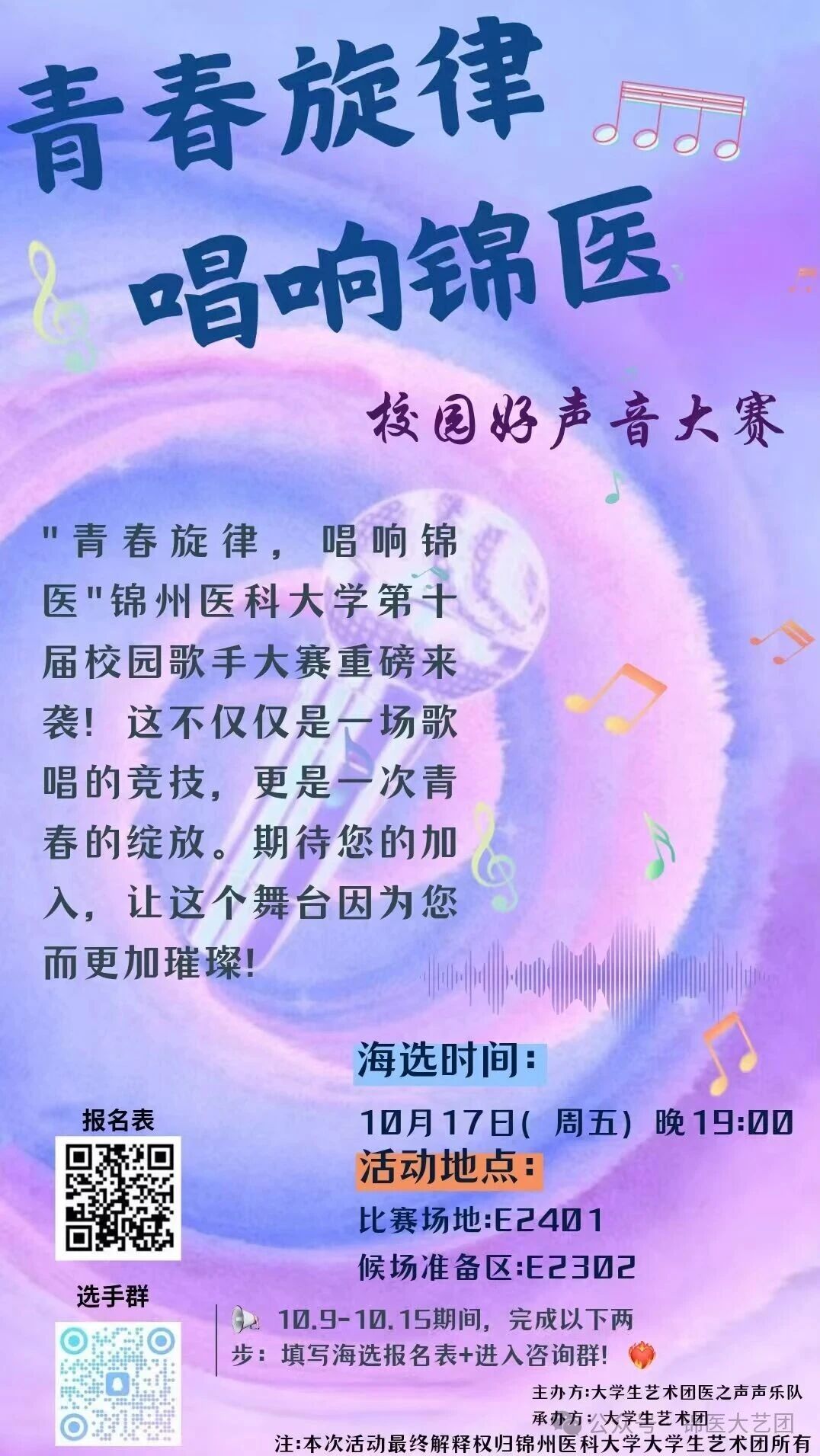 青春是什么?是操场上奔跑的身影,是教室里埋头的专注,更是舞台上歌唱的你眼中闪烁的光芒。“青春旋律,唱响锦医”,让我们以歌为媒,以声为介,在这场大赛里,唱出对音乐的执着,唱出对青春的热忱,唱出属于我们这代人的精神风貌。